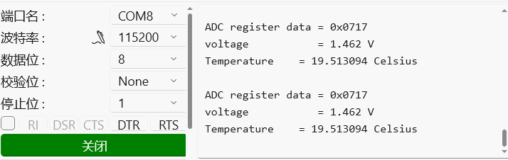 开发板工程调试:串口连续打印 ADC 电压转换值和温度值;