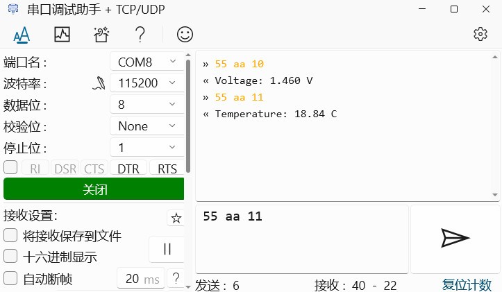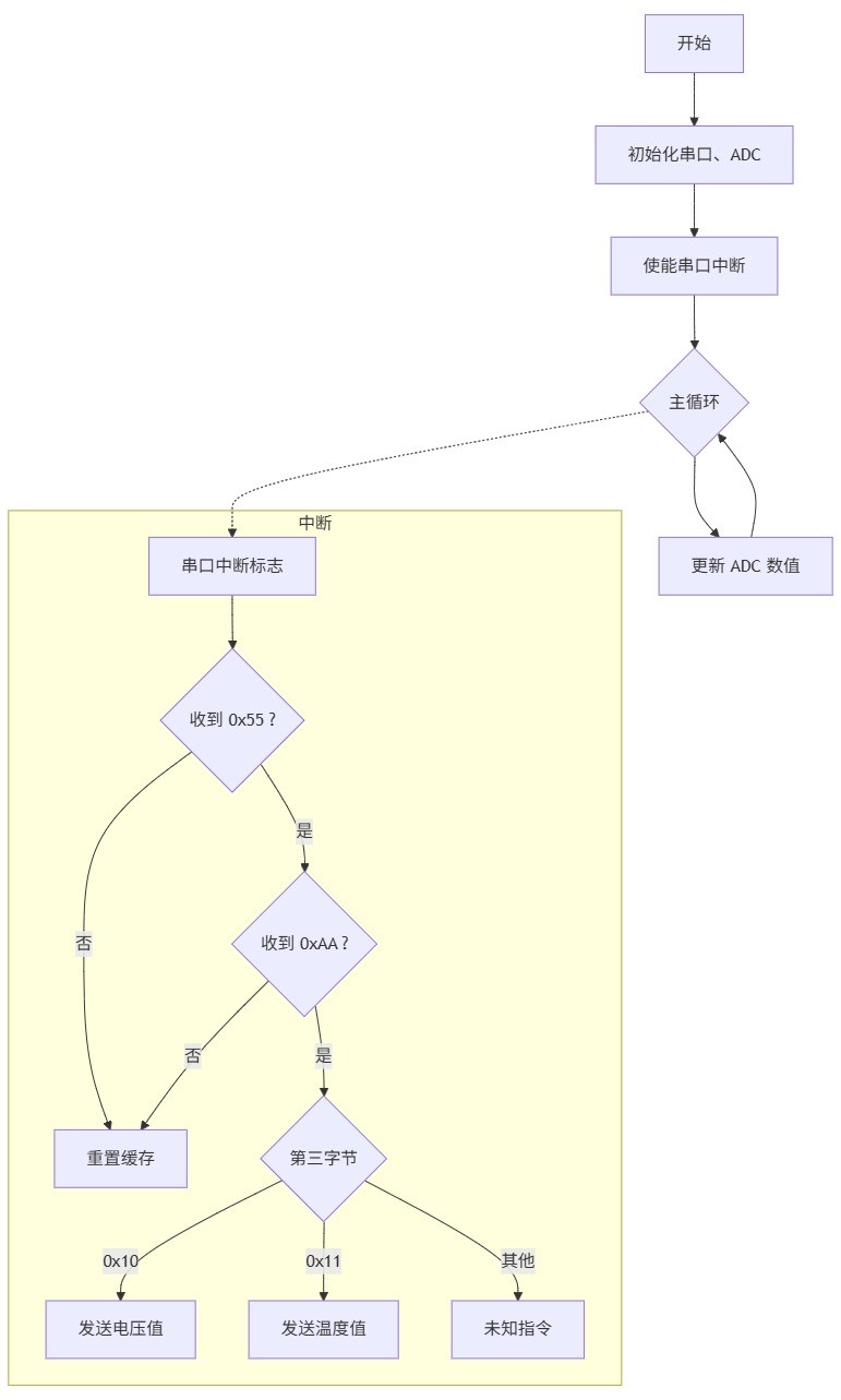 为了便于后面通过 LabVIEW 进行精确的自动化数据采集,避免串口连续发送可能引起的延迟和数据遗漏等影响,改进代码并使能串口中断,通过上位机发送指令获取 ADC 电压和温度。