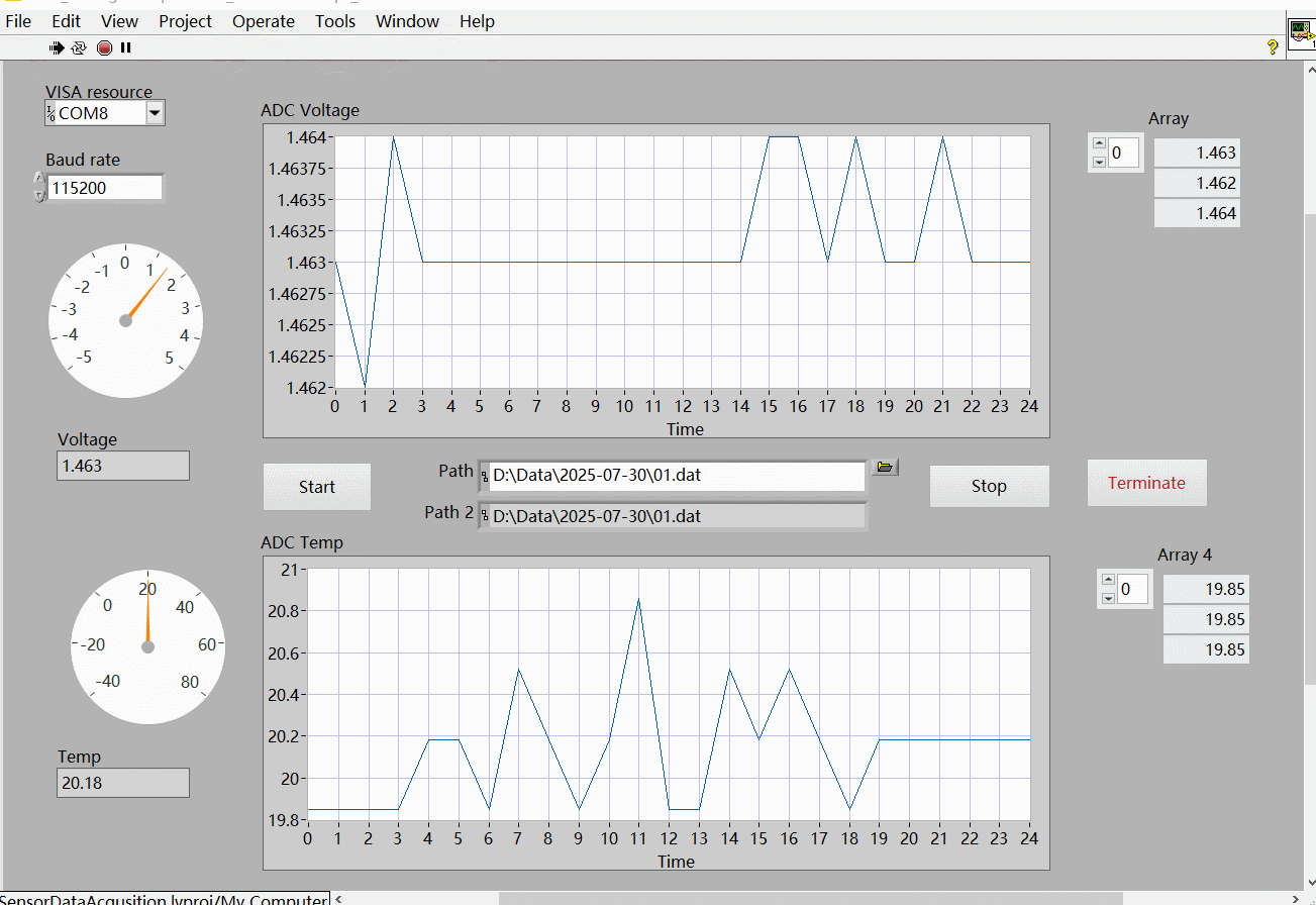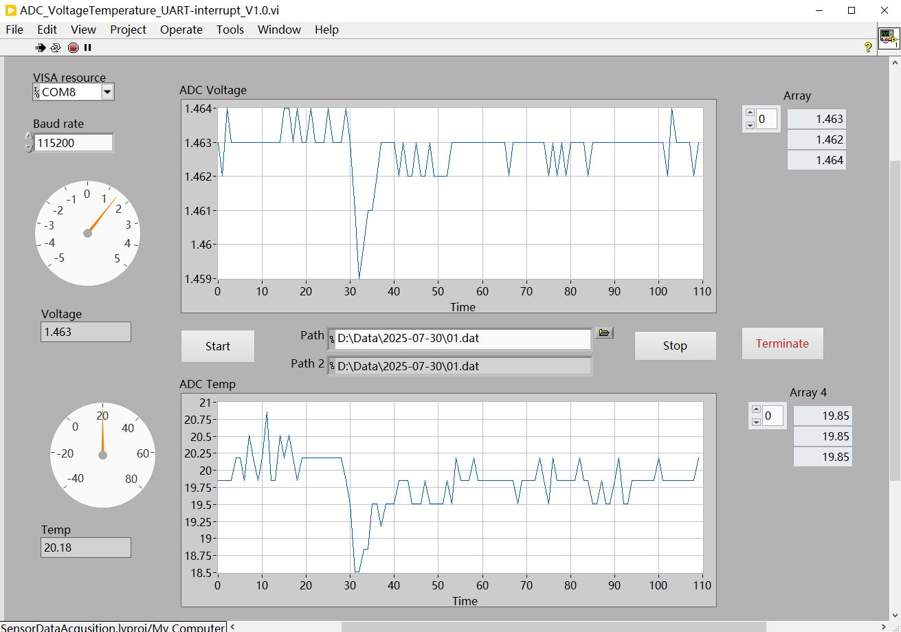 使用串口中断方案实现 ADC 电压和温度数据的采集,以及相应的 LabVIEW 上位机设计。