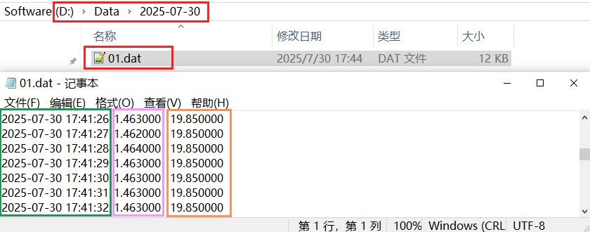 点击 Stop 按钮,停止数据采集,文件自动保存至预设路径,3 列数据依次为 日期-时间-数值