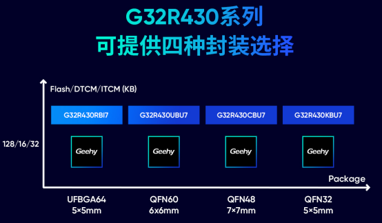 G32R430工作电压1.7V3.6V,工作温度覆盖-40℃105℃,符合IEC 61508工业级标准,可适应复杂工控环境;ESD抗干扰性能强,HBM 4kV/CDM 1kV;并支持上电/掉电复位和可编程电源电压检测器。G32R430系列提供UFBGA64、QFN60、QFN48、QFN32四种紧凑型封装选择,可满足不同应用场景需求。