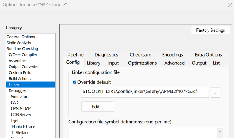 打开工程配置(Options),指定使用自定义的.icf链接文件。