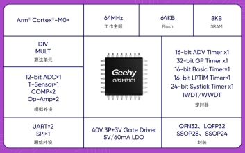 极海G32M3101系列可提供LQFP32、QFN32、SSOP28、SSOP24四种封装选择,产品相应的数据手册、用户手册、应用笔记、开发板资料及软硬件配套文档同步在geehy.com官网上架。