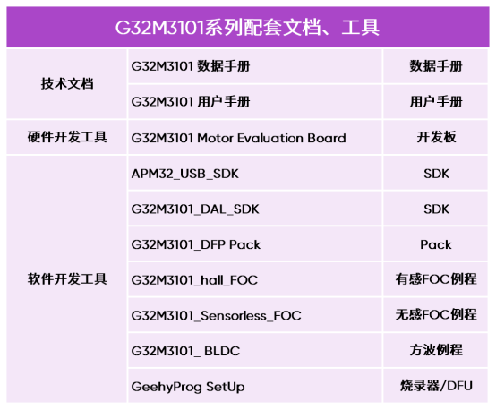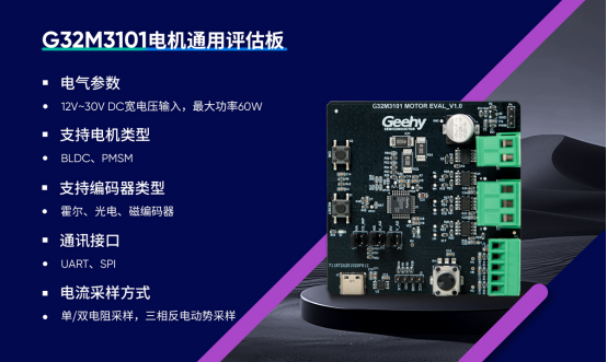 随着产品同步推出G32M3101电机通用评估板,可支持对DC直流电压12V~ 30V输入,最大功率60W的电机控制应用进行快速开发与方案验证,帮助用户更好了解极海芯片特性,方便开发及算法移植测试。