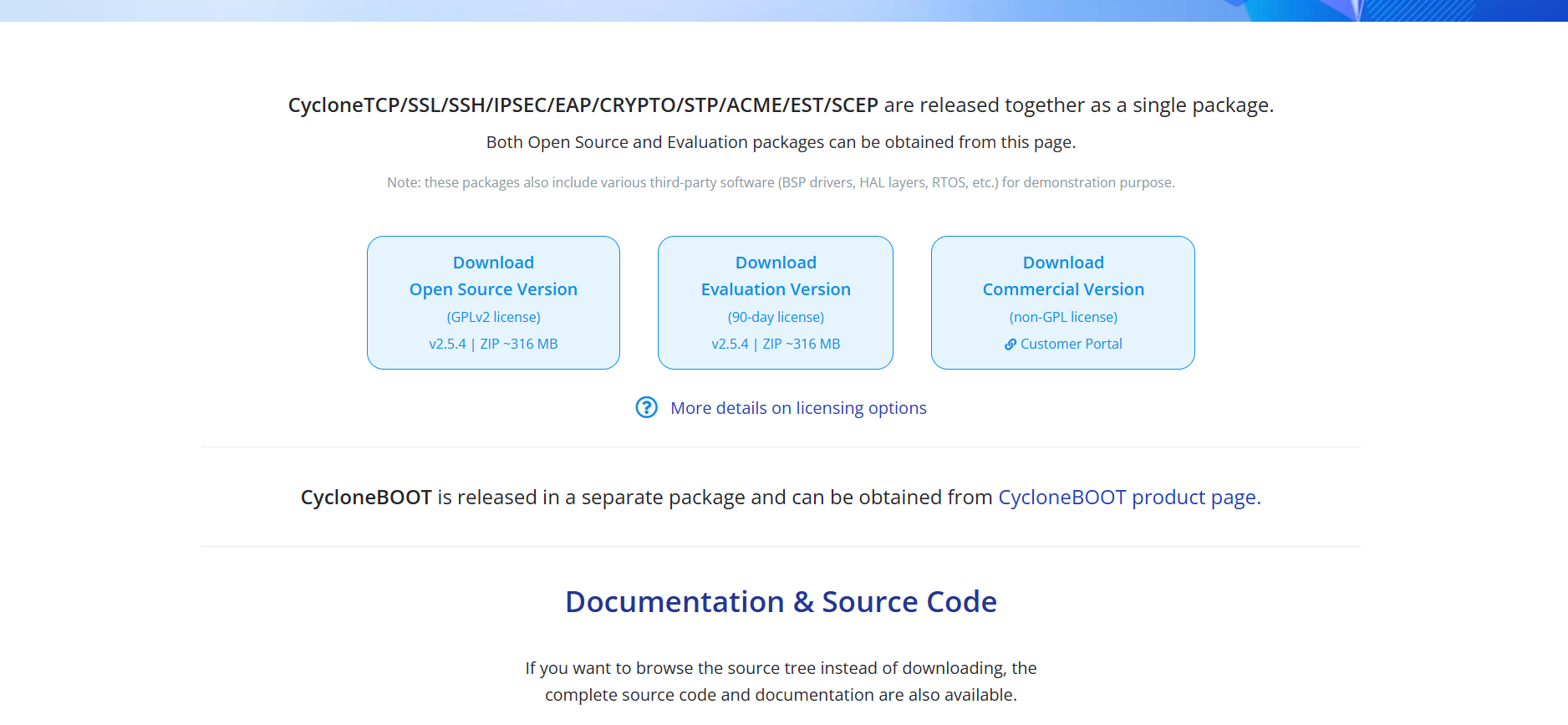 1.先从[https://www.oryx-embedded.com/download/](https://)官网下载最新版本的CycloneTCP网络协议栈,这里可以选用Open Source Version,反正也只是做评估测试使用;