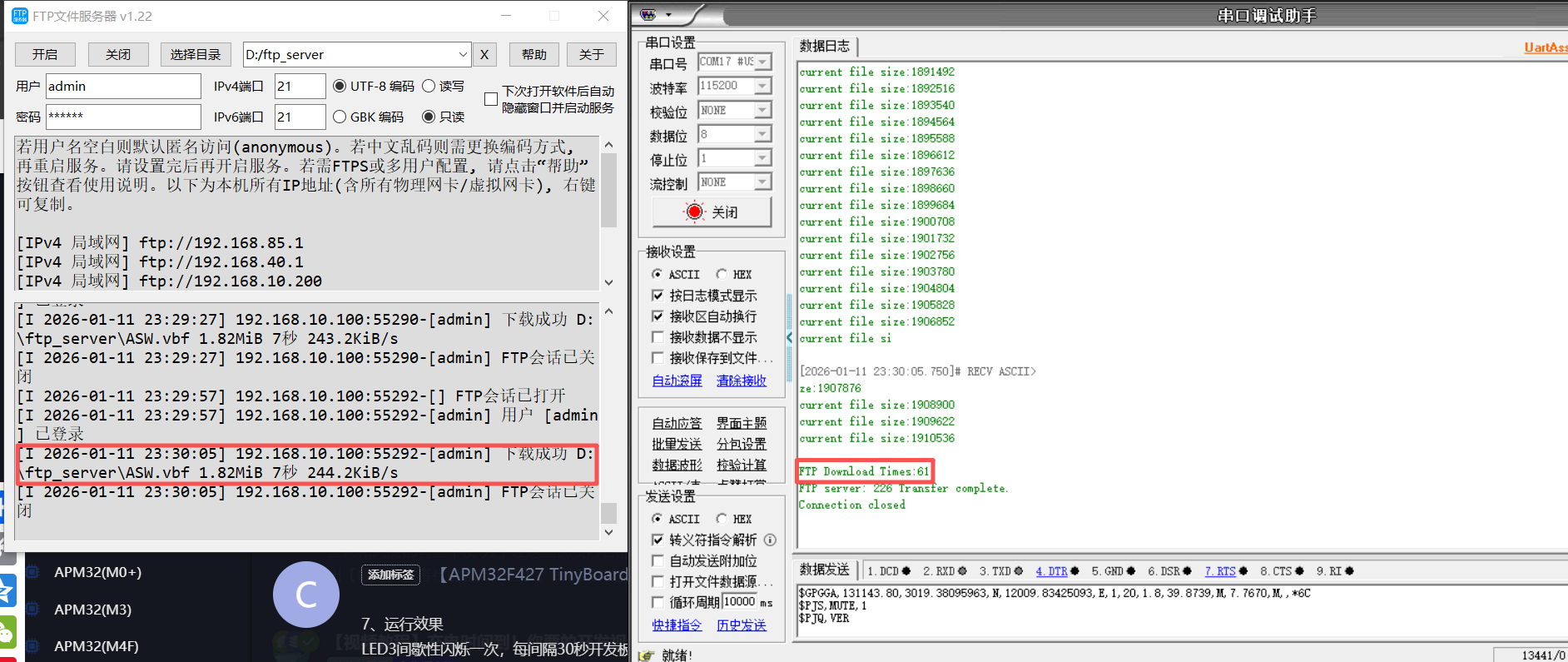 4.这里我们计划实现一个ftp客户端的自动文件下载功能,即在PC端搭建一个FTP server,然后将开发板与PC通过网线进行连接,配置开发板为静态IP(192.168.10.100),PC端IP为(192.168.10.200),开发板会每间隔30秒自动从FTP Server上下载一个约1.8M的文件,然后通过串口进行下载过程的打印,以此来评估开发板网络外设的性能及可靠性;