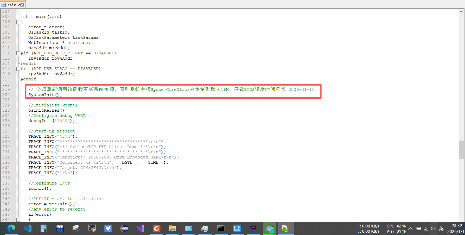 在main函数的头部,必须重新调用SystemInit();来更新SystemCoreClock的值为240000000,否则系统会按照16000000的主频进行systick的初始化(仿真发现其实在启动文件内会先调用SystemInit(),SystemCoreClock的值会更新为240000000,但是进入main函数后,这个数值又恢复成16000000),导致调度周期异常,该现象在APM32F4xx_SDK_V1.5.0\Examples\Board_APM32F427_Tiny\RTOS\CMSIS_FreeRTOS工程中也是如此,希望官方可以研究解答一下疑问;