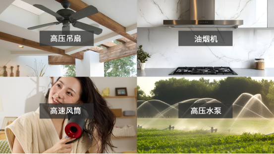 产品均可应用于:高压吊扇、高速风筒、油烟机、高压水泵 等场景。