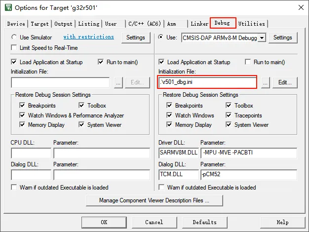 2)Debug选项卡下添加仿真时的解密脚本:r501.ini,并选择正确的仿真器。