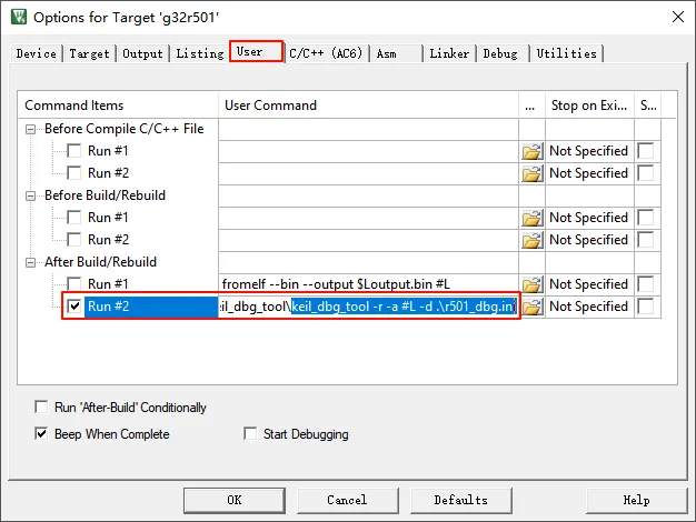 1)在User选项卡添加keil_dbg_tool(需Python 3.11及以上环境)相关指令进行,如:................\utilities\keil_dbg_tool\keil_dbg_tool -r -a