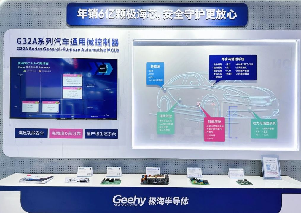 本次展会,极海重点展出了四大核心产品线,覆盖智能驾驶、车身控制、自动泊车等关键领域,全系列产品均已规模量产,并符合AEC-Q100和ISO 26262功能安全产品认证标准,可为车企提供高可靠、高安全的多元化芯片产品选择。
