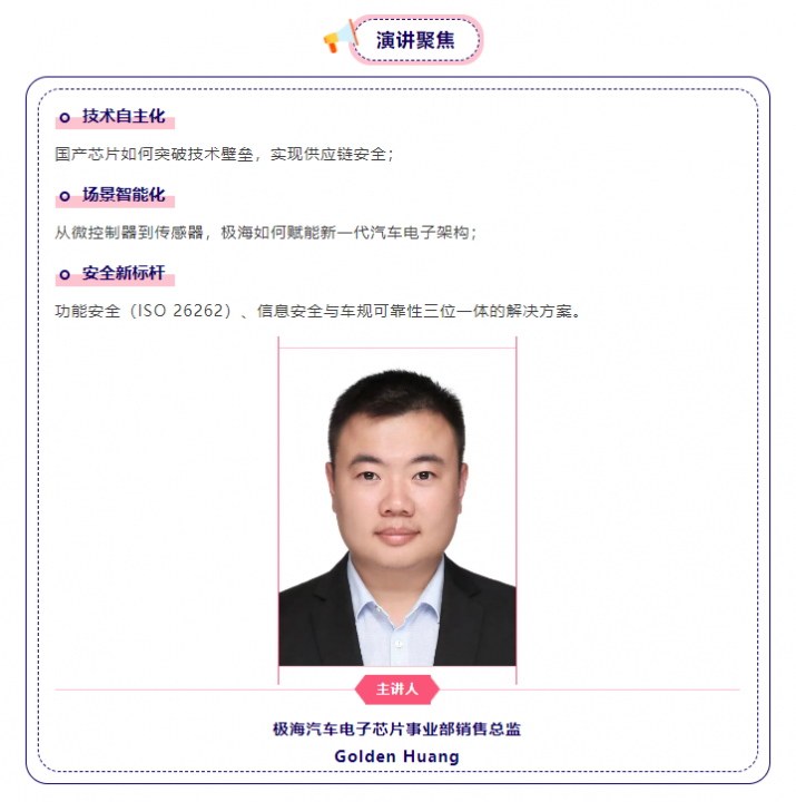 4月26日11:45-12:00,极海汽车电子芯片事业部销售总监Golden Huang将在国家会议中心(上海)23米层03会议室(北)发表主题演讲《自主可控|极海汽车芯提供高安全&智能化芯方案》