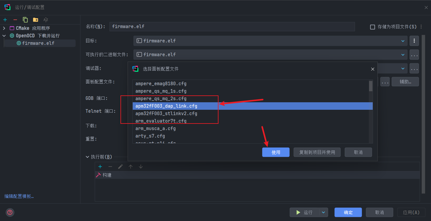 根据你的下载器选择以一个,比如stlinkv2就选名字里带stlink的,然后点击使用即可,如果需要修改配置文件就点击复制到项目使用